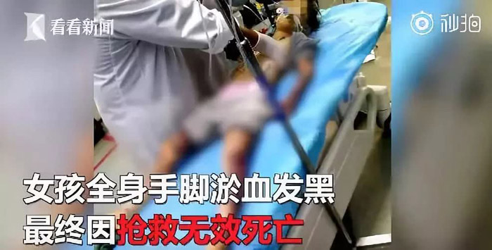 7-ئاينىڭ 21-كۈنى چۈشتىن كىيىن سائەت 4تىن ئاشقاندا، خەينەن ئۆلكىسى مەلۇم دوختۇرخانىدا بىر ئەر كىشى كىچىك بىر قىزنى كۆتۈرۈپ، ھۇدۇققىنىچە تىز قۇتقۇزۇش بۆلۈمىگە كىرىپ كەلدى. تىز قۇتقۇزۇش بۆلۈمىدىكى دوختۇرلار بۇ قىزنىڭ پۇت قوللىرىدا قان ئۇيۇپ، پۈتۈن بەدىنىنىڭ كۆكىرىپ كەتكىنىنى، ئۇنىڭدا ئاللىقاچان ھاياتلىق بەلگىلىرى قالمىغانلىقىنى بايقىدى. بۇ قىزنى كۆتۈرۈپ دوختۇرخانىغا ئەكەلگەن ئەرمۇ، قىزنىڭ ئۆزىگە گەپ ياندۇرغانلىق سەۋەبىدىن، ئۇنى تاسما ۋە كىيىم جازىسى بىلەن بىر سائەتتىن ئارتۇق ئۇرغانلىقىنى ئىتراپ قىلدى.
