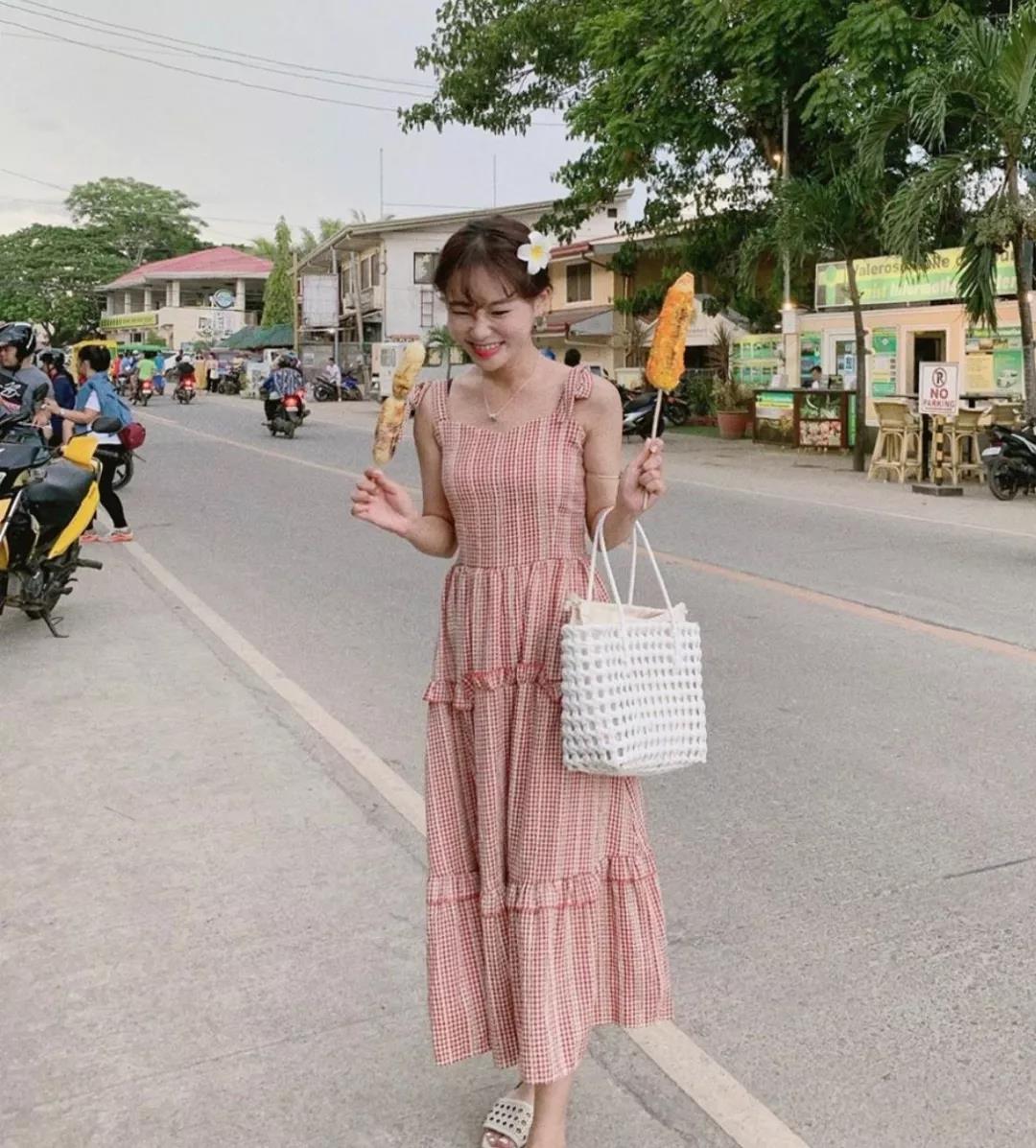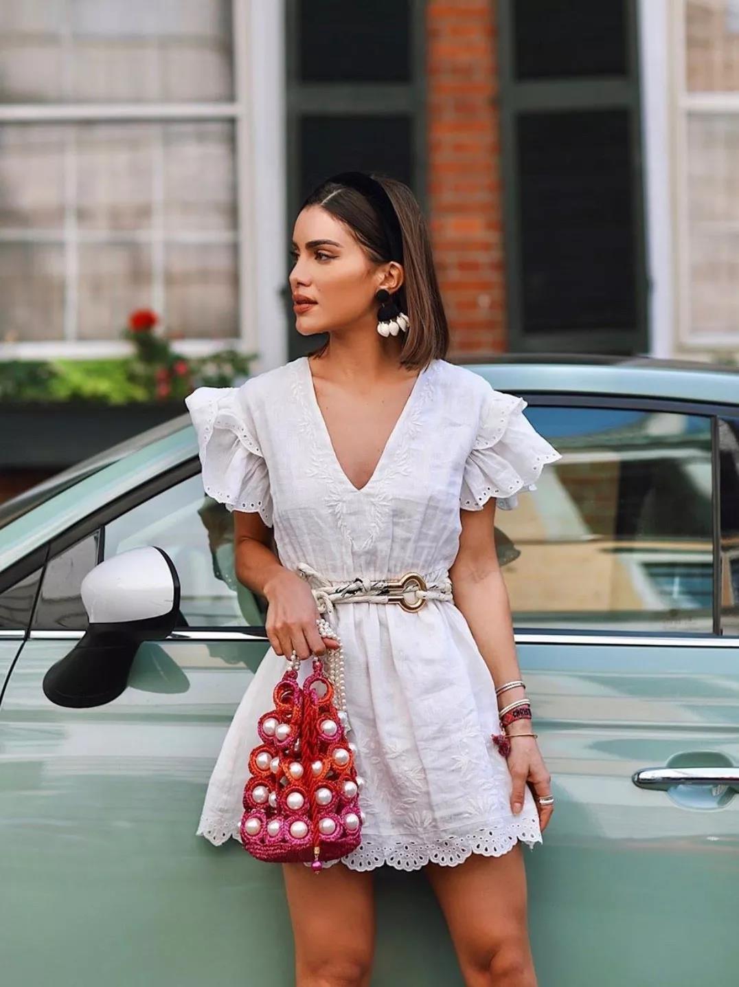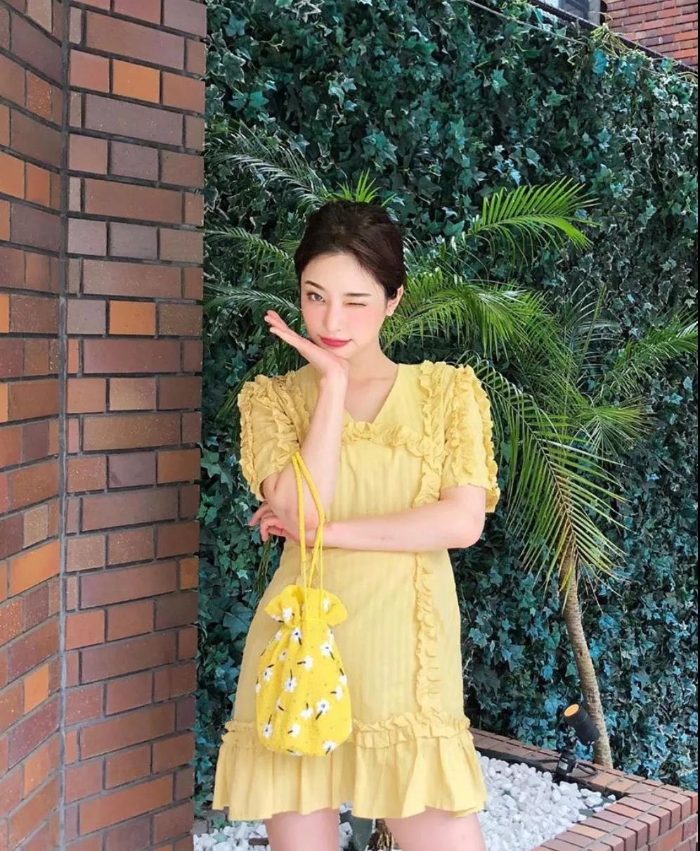 سېرىق رەڭلىك قىسقا كۆينەك، تىرىسى ئاق خانىم-قىزلارغا ماس كىلىدىغان بولۇپ، گۈللۈك بوغما ئېغىز سومكا، بۇ خىل كۆينەكنىڭ ئەڭ ياخشى زىننىتىدۇر.