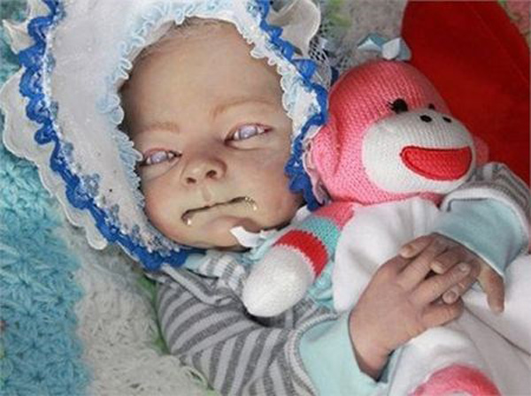قولىدا قونچاق تۇتىۋالغان بۇ بوۋاقنىڭ كۆزلىرى نۇرىنى يوقىتىپ گالۋاڭلىشىپ قالغان، ئېغىزىدىكى ھىڭگاي چىشلىرى سىرتىغا چىقىپ قالغان بولۇپ، ئۇلارنىڭ نورمال بوۋاق ئىكەنلىكىگە ھېچكىم ئىشەنمەيدۇ.