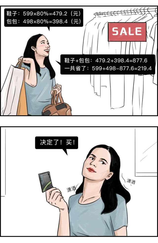 "بىر توپ توخۇ بىلەن توشقاننىڭ جەمئى 88كاللىسى ۋە 244 پاچىقى بار، ئۇنداقتا توخۇ نەچچە؟ توشقانچۇ؟" دىگەن ھىسابنى ئىشلىيەلمەي بېشى قېتىپ ئولتۇرۇپ كىتىدۇ؛ ئەمما 599يۈەنلىك ئاياغنىڭ ۋە 498يۈەنلىك سومكىنىڭ %20 باھاسى چۈشۈرۈلگەنلىكىنى كۆرسە، قانچىلىك باھاسى چۈشكەنلىكىنى كۆڭلىدىلا موچەن سىنىتلىرىگىچە ئىنىق ھىسابلاپ چىقىرالايدۇ.