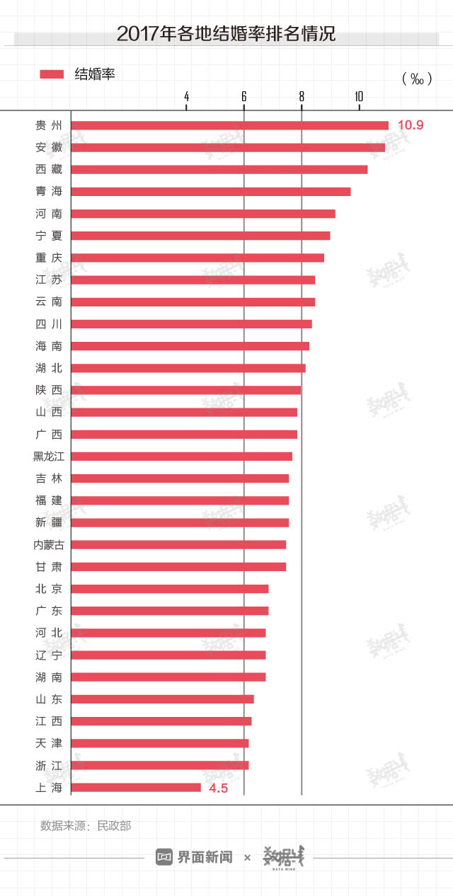 مۇناسىۋەتلىك ئورۇنلار، دۆلەتلىك سىتاستىكا ئىدارىسى ئاجرىشىش نىسبىتىنى ھىسابلاش ئۇسۇلىدىن پايدىلىنىپ تۇرۇپ، 2017-يىللىق ھەرقايسى جايلاردىكى تويلىشىش ۋە ئاجرىشىش نىسبىتىنى ھىسابلاپ چىققان. بۇ قېتىملىق ھىسابلاش نەتىجىسىدە كۆرسىتىلىشىچە، 2017-يىلى دۆلىتىمىز ھەرقايسى جايلىرىدىكى تويلىشىش نىسبىتى  ‰10.9-4.5ئارىسىغا مەركەزلەشكەن؛ بۇنىڭ ئىچىدە گۇيجۇ ئۆلكىسىنىڭ تويلىشىش نىسبىتى ئەڭ يۇقىرى، شاڭخەي شەھىرىنىڭ ئەڭ تۆۋەن ئىكەن.