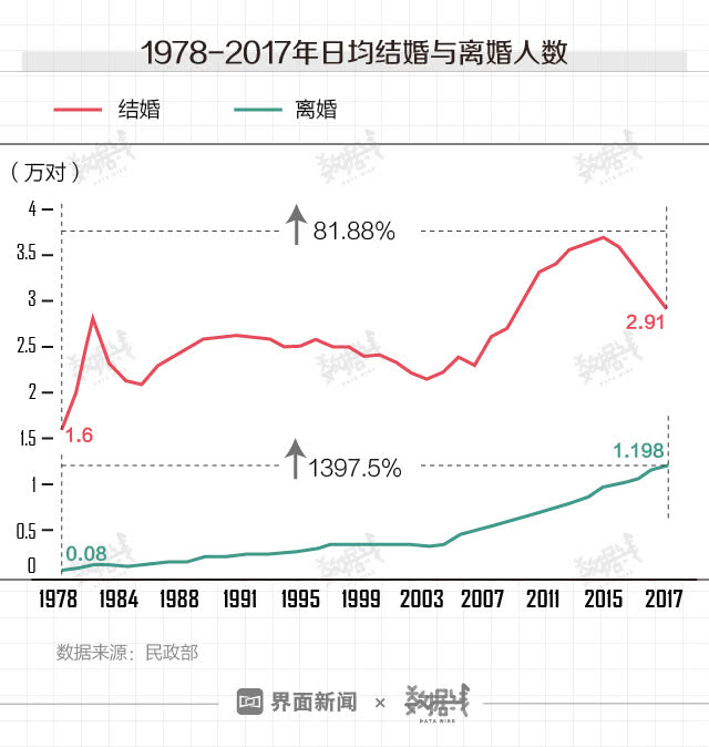 ئالاقىدار ئورۇنلارنىڭ سىتاستىكا سانلىق مەلۇماتلىرىغا ئاساسلانغاندا، ئەگەر 1978-يىلىدىكى تويلاشقانلار ۋە ئاجراشقانلار كۈنلۈك ئوتتۇرىچە سانىنى باشلىنىش نوقتىسى قىلساق، 2017-يىلىغا كەلگەندە، ئاجراشقانلار كۈنلۈك ئوتتۇرىچە سانىنىڭ ئېشىش نىسبىتى %1397.5گە يەتكەن بولۇپ، ئەينى يىلىدىكى تويلاشقانلار كۈنلۈك ئوتتۇرىچە سانى ئېشىش نىسبىتىنىڭ (%81.88) 17ھەسسىسىگە يەتكەن.