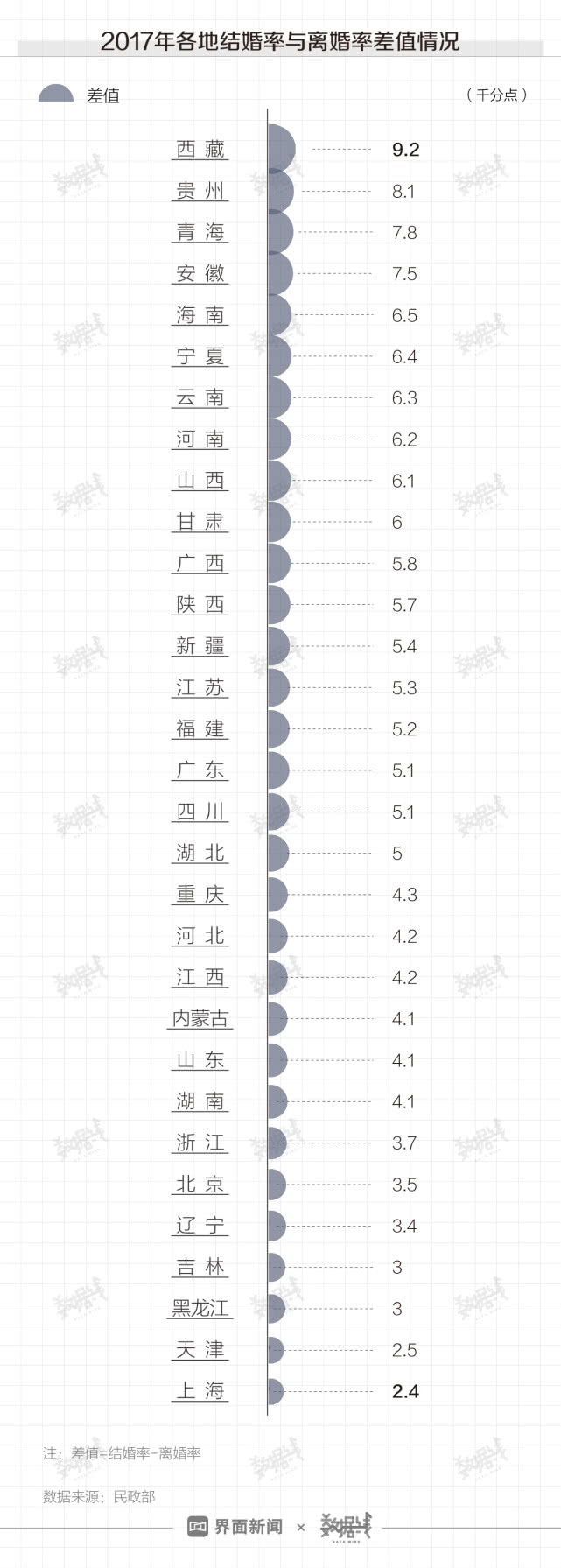 ھەرقايسى جايلارنىڭ تويلىشىش نىسبىتى ۋە ئاجرىشىش نىسبىتى ئوتتۇرسىدىكى پەرق زادى قانچىلىك چوڭ؟ ئالاقىدار تارماقلارنىڭ سىتاستىكىسىغا ئاساسلانغاندا، 2017-يىلىدىكى دۆلىتىمىز ھەرقايسى جايلىرىنىڭ تويلىشىش نىسبىتى ۋە ئاجرىشىش نىسبىتى پەرق قىممىتى  ‰9.2-2.4ئارىسىدا بولغان؛ بۇنىڭ ئىچىدە، شاڭخەينىڭ پەرق قىممىتى ئەڭ كىچىك بولۇپ، پەقەت  ‰2.4 ئىكەن.