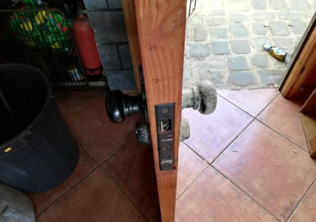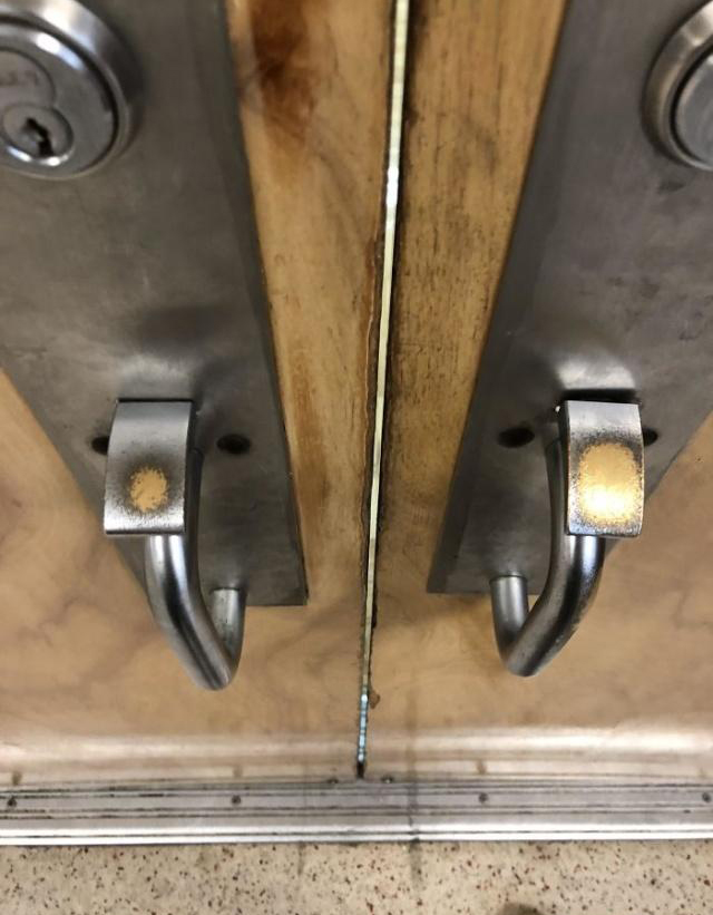 يۇقارقى سۈرەتتىكىسى، دېڭىز بويىغا جايلاشقان بىر ئۆينىڭ ئىشكى؛ ئۆينىڭ ئىچىدىكى ئىشىك تۇتقۇچى ئۆز ھالىتىنى ساقلاپ قالغان، ئەمما سىرتىدىكى تۇتقۇچ بولسا، دېڭىز شامىلىنىڭ تەسىرىدە چىرىپ كەتكەن.