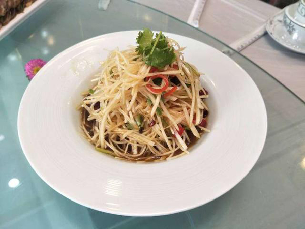 3. ئالدى بىلەن تەخسە يۈزىگە بىر قەۋەت ياپراقچە ھالىتىدە توغرالغان تەرخەمەك تىزىپ چىقىمىز؛ تەييارلىغان چامغۇر قەلەمچىسىگە مۇچ يېغى، ئاچچىقسۇ، تېتىتقۇ، تۇز، كۈنجۈت مېيى قاتارلىقلاردىن مۇۋاپىق مىقداردا قوشۇپ تەكشى ئارىلاشتۇرغاندىن كىيىن، تەخسىدىكى تەرخەمەك ئۈستىگە ئۇسۇپ ئالىمىز؛ ئاخىرىدا چامغۇرنىڭ ئۈستىگە ئازراق قارا كۈنجۈت سېپىۋەتسەك ۋە قەلەمچە ھالىتىدە توغرالغان قىزىلمۇچتىن ئازراق قۇشۇۋەتسەكلا، بۈگۈنكى چامغۇردىن تەييارلانغان سۇغۇق سەي تەييار بولىدۇ.