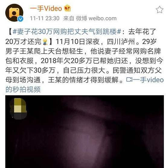 ئىككى كۈننىڭ ئالدىدا، سىچۈەن ئۆلكىسىدىكى بىر ئەر، تۇيۇقسىزلا بىنادىن سەكرەپ ئۆلىۋالماقچى بولغان؛ بۇ قانداق ئىش؟ ئەسلىدە، ۋاڭ فامىلىلىك بۇ ئەر، ئۇ كۈنى ئەمدى ئىشتىن چۈشۈپ ئۆيگە قايتىپ كەلگىنىدە، ئويلىمىغان يەردىن ئايالى ئۇنىڭغا غەزىۋى تولۇپ تاشقۇدەك ئەھۋالدىن بىرنى ئېيتقان: ۋاڭ ئەپەندىمنىڭ ئايالى، "قوش 11" كۈنى، ساق 300مىڭ يۈەن پۇل خەجلىۋەتكەن. غەزىۋىنى بېسىپ بولالمىغان ۋاڭ ئەپەندىم، ئايالىنى ئەيىبلەش جەريانىدا تېخىمۇ بەك ئاچچىقلىنىپ كېتىپ، ئۇنىڭدا ئۆزىنى ئۆلتۈرۋىلىش خىيالى پەيدا بولغان، شۇڭا بىنانىڭ ئۆگزىسىگە چىقىۋېلىپ، بىنادىن سەكرەپ ئۆلىۋالماقچى بولغان.