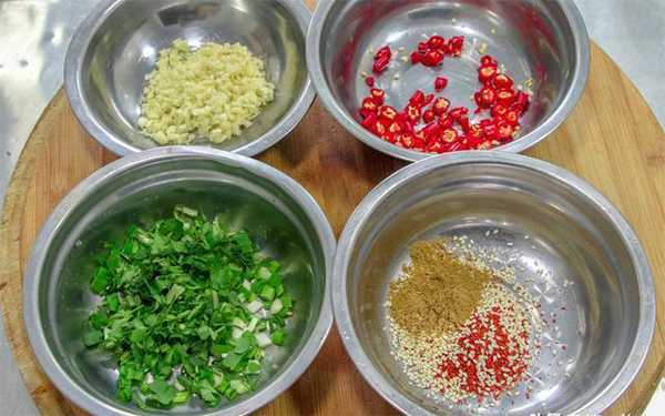 بىرىنچى قەدەمدە ماتېرىيال تەييارلايمىز: سامساق تەييارلاپ، ئۇششاق چاناپ توغرايمىز؛ كىچىك ئۇچلۇق قىزىلمۇچنى قىسقا قىسقا بۆلەك ھالىتىدە توغرايمىز؛ غولپىيازنى چەمبەر شەكىلدە توغرايمىز؛ يۇمغاقسۈتنى قىسقا بۆلەك ھالىتىدە توغراپ تەييارلايمىز.