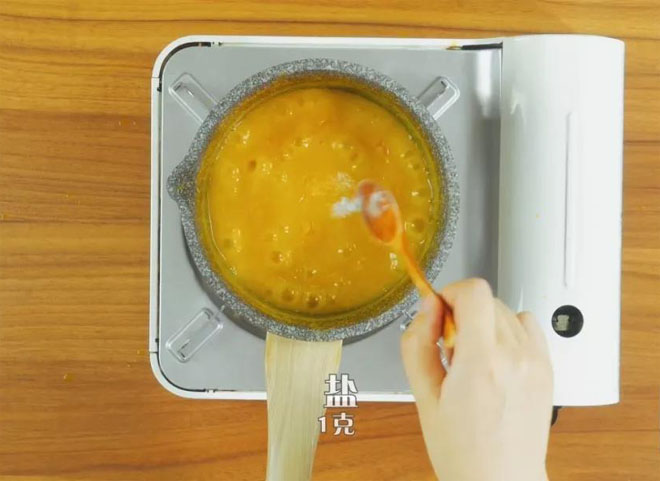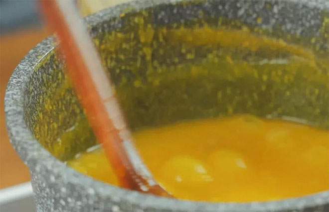 كىچىك ئوتتا قايناتقاچ، توختىماي مالتىلاپ شىكەرنى تۇلۇق ئىرىتىمىز ھەمدە كاۋا شەربىتى قۇيۇق ئۇماچ ھالىتىگە كەلگۈچە مالتىلاشنى توختاتمايمىز.