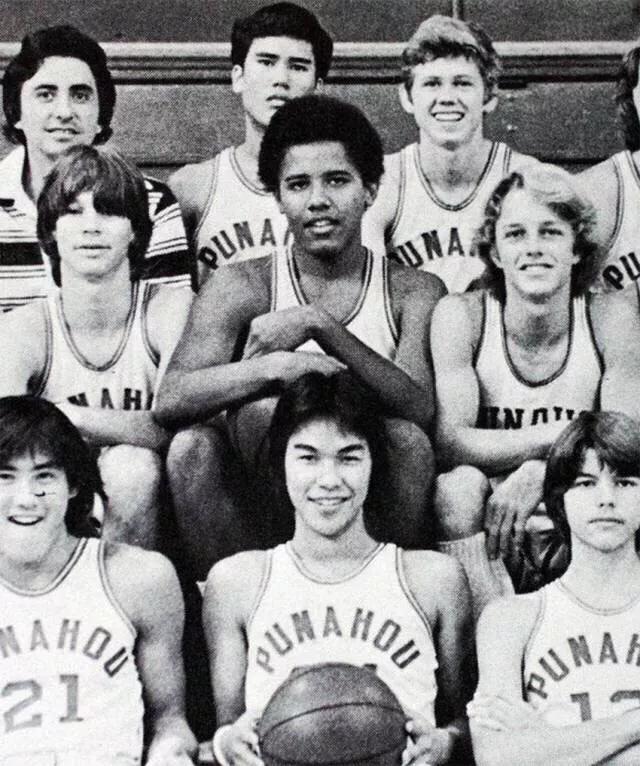 1979-يىلى، ئوبامانىڭ مەكتەپ ۋاسكىتبول كوماندىسىدىكى ساۋاقداشلىرى بىلەن چۈشكەن سۈرىتى.