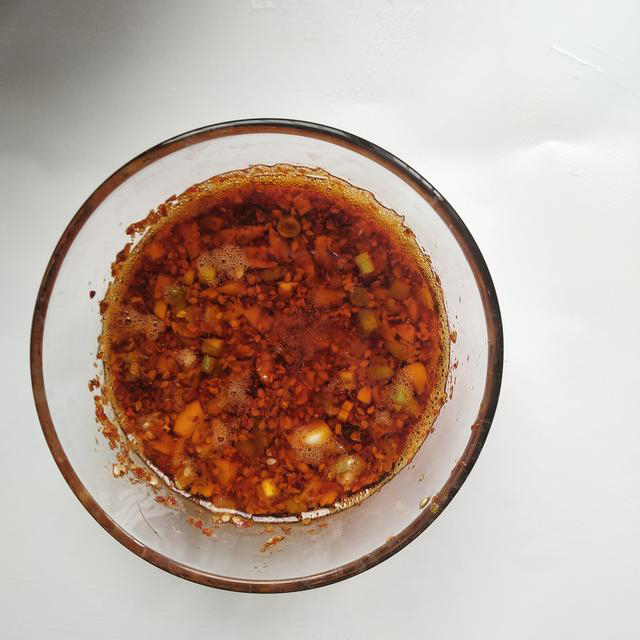 بۇ ۋاقىتتا تەملەشتۈرۈشكە ئىشلىتىدىغان قىيام تەييارلايمىز. چىنىگە سامساق چانالمىسى، غولپىياز مايسىسى چانالمىسى، ئاق كۈنجۈت ۋە قىزىلمۇچ تالقىنى قاتارلىقنى سېلىپ، ئۈستىگە بىر چۆمۈچ قىزىتىلغان ماي قۇيىمىز؛ كەينىدىن ئۈستىگە ئۈچ قوشۇق جىياڭيۇ، ئىككى قوشۇق ئاچچىقسۇ، يېرىم قوشۇق تۇز قوشۇپ ئارىلاشتۇرساق، تەملەشتۈرۈش قىيامى تەييار بولىدۇ.