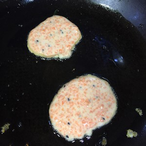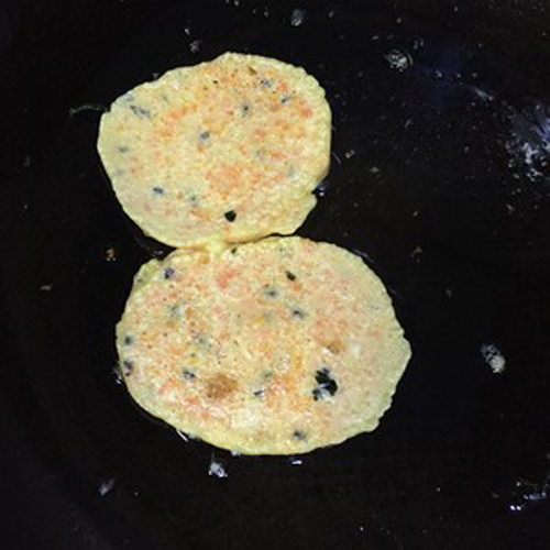 تىگى چاپلاشماس قازانغا ئازراق ماي قۇيۇپ، ئالدىدا تەييارلىغان ئۇماچتىن يېرىم چۆمۈچ ئېلىپ قازانغا قۇيۇپ داغلايمىز؛ ئوتتۇرلۇقتا كۆپۈكچە پەيدا بولۇشقا باشلىغاندا يەنە بىر يۈزىنى ئۆرۈپ داغلايمىز.