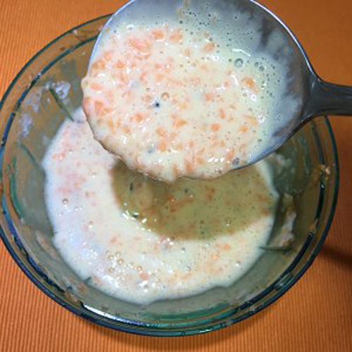 سەۋزىنى پاكىزە يۇغاندىن كىيىن، كۆكتا ئىزىش ماشىنىسىدا ئۇششاق ئىزىمىز؛ ئۈستىگە تۇخۇمنى چېقىپ، ئازراق ئۇن، سۇ، تۇز قوشىمىز.