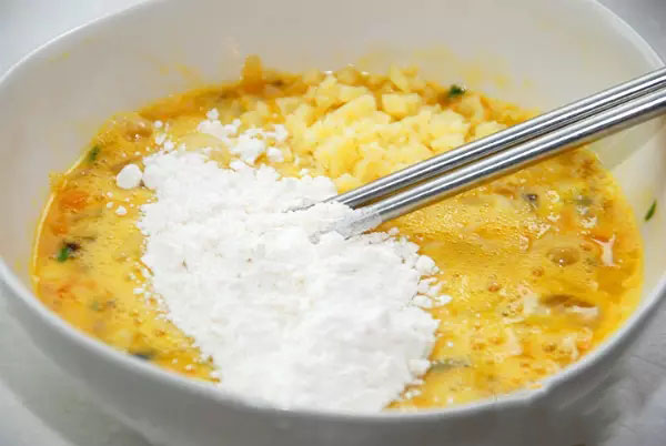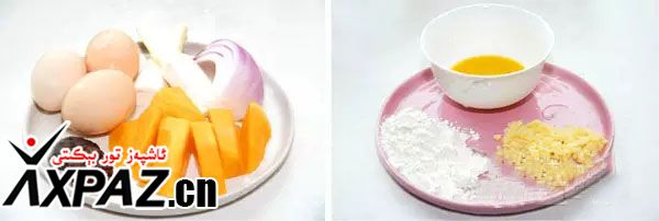 1 . تۇخۇم 3 تال ، ئېرىمچىك مۇۋاپىق مىقداردا ، كىراخمال، كۆكتاتلار ( موگو ، كاۋا ، پىياز ) قاتارلىقلارنى تەييارلىۋالىمىز . ئۇلارنى ئايرىم ئايرىم قاچىغا توغراپ ئېلىۋالىمىز .