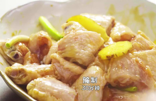 توغرالغان غولپىياز، زەنجىۋىل، سامساقلارنى توغرالغان توخۇ قانىتىغا قوشۇپ، ئۈستىگە بىر قۇشۇق تېتىتقۇ ھارىقى، بىر قوشۇق تۇز قوشۇپ، تەكشى ئارىلاشتۇرغاندىن كىيىن يېرىم سائەت قويۇپ تۇزلايمىز.