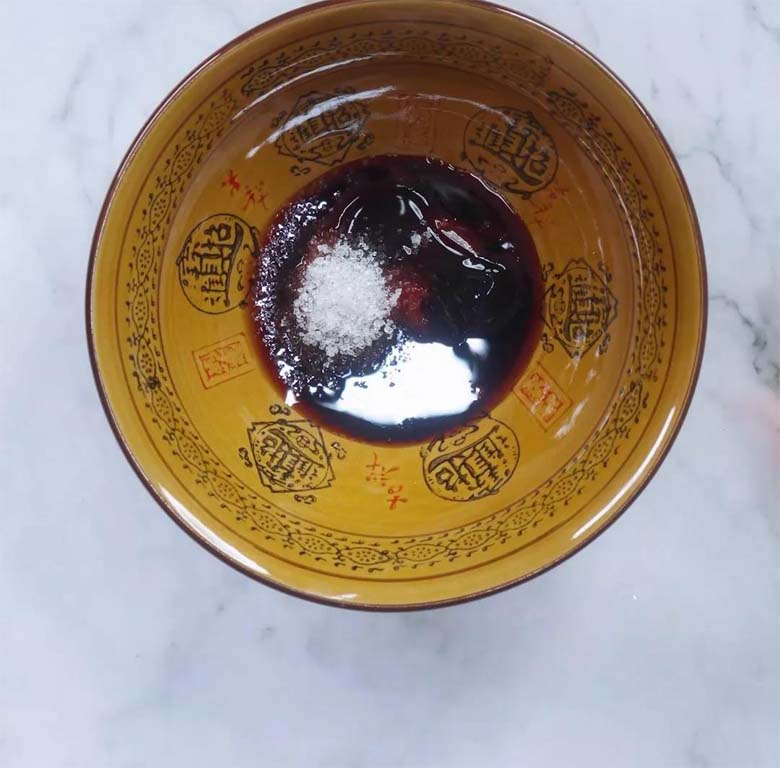 قىيام تەييارلىۋالىمىز: چىنىگە بىر قوشۇق پەمىدۇر قىيامى سېلىىپ، ئۈستىگە ئىككى قوشۇق شىڭچوۋ جىياڭيۇسى، ئازراق لاۋچوۋ جىياڭيۇسى، بىر قوشۇق شىكەر قوشىمىز.