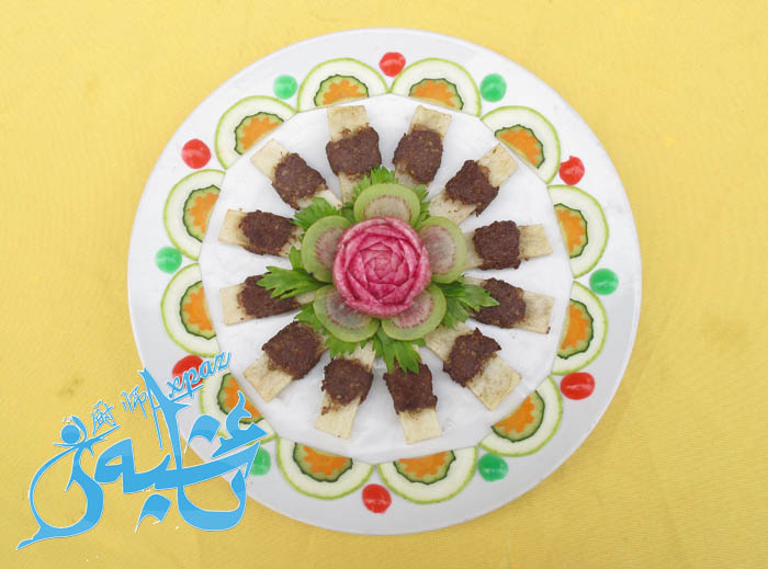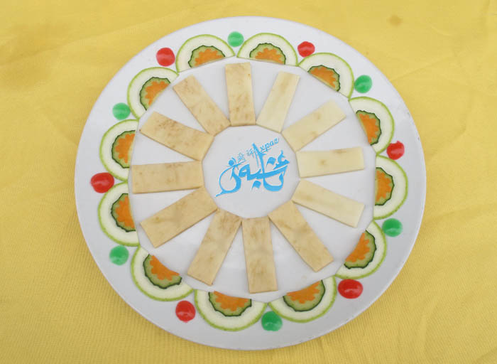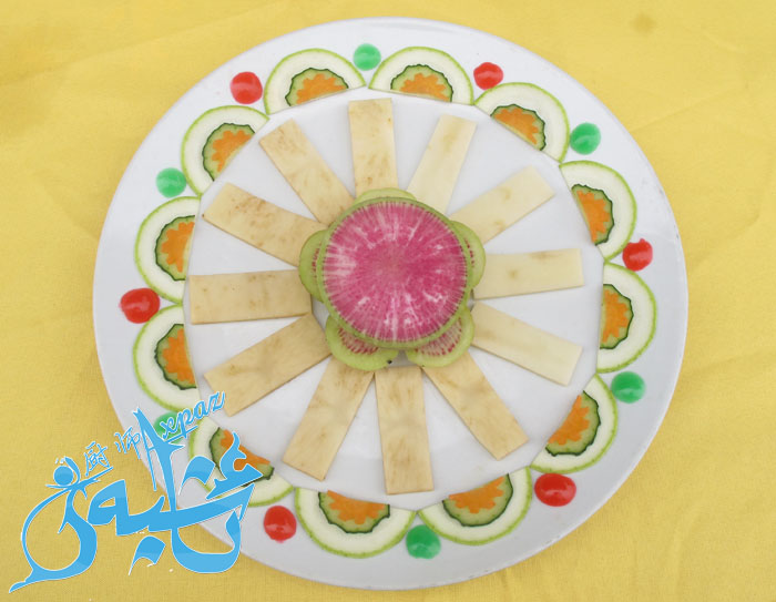 تەخسە بېزەش: سەي كاۋىسى، قىزىل تۇرۇپ، سەۋزە، تەرخەمەك، گىلاسلاردىن پايدىلىنىپ تەخسىنى بېزىۋالىمىز.
