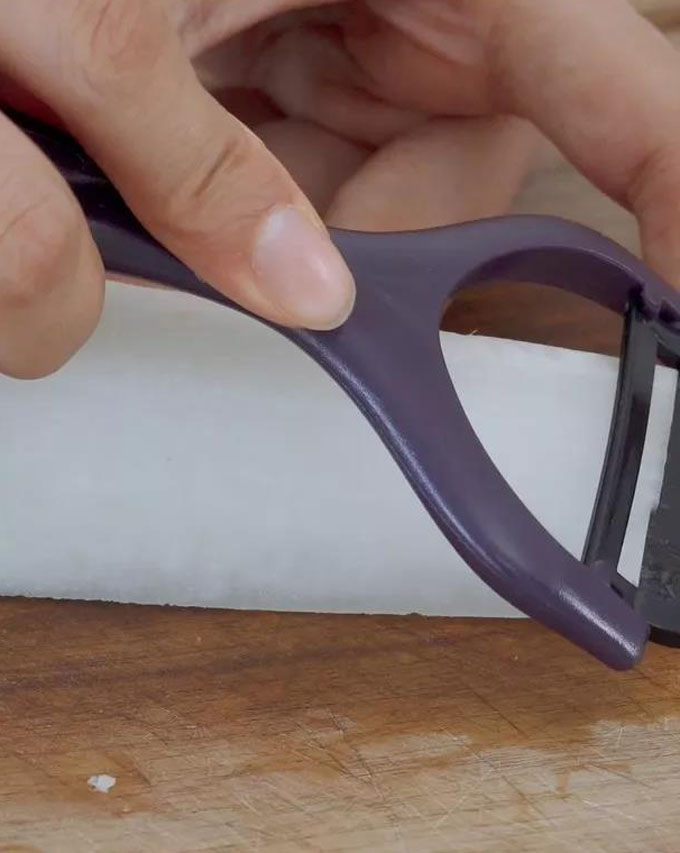 تۇرۇپنى قىيغۇدا قىيىپ (ياكى نېپىز توغرىساقمۇ بولىدۇ) ئۇزۇنراق نىپىز پارچە ھالەتكە ئەكىلىمىز.