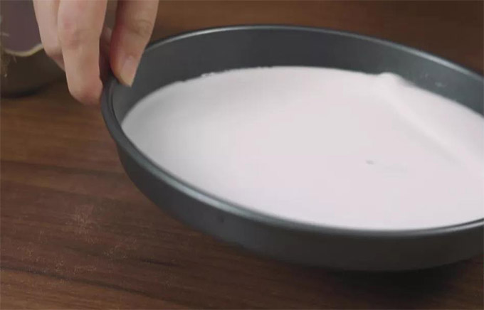 داتلاشماس پولات تەخسىدىن بىرنى تەييارلاپ، چاپلىشىۋىلىشنىڭ ئالدىنى ئېلىش ئۈچۈن ئىچىكى قىسىمىغا بىر قەۋەت ماي سۈرتىمىز؛ كەينىدىن تەخسىگە بىر قوشۇق كىراخمال قۇيۇپ، تەخسىنى مىدىرلىتىپ كىراخمالنى تەكشى يېيىلتىمىز؛ كىراخمال بەك كۆپ بولۇپ كەتمىسۇن، بولمىسا راڭپىزا قېلىن چىقىۋالىدۇ؛ تەخسىنى دۈملەش قازىنىغا سېلىپ، تۇۋاقنى يېپىپ چوڭ ئوتتا ئىككى مىنۇت دۈملەپ پىشۇرىمىز.
