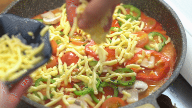 تۇۋاقنى ئېچىپ ئۈستىگە ئازراق مارىلا چېسسي پارچىسى (芝士碎) سېپىۋەتكەندىن كىيىن، تۇۋاقنى يېپىپ، يەنە 10-5مىنۇت دۈملەپ، چېسسي پارچىسىنى ئىرىتىۋىتىمىز.