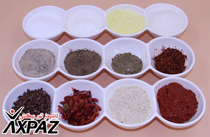 تەم خۇرۇچلىرى:تۇز ،تېتىتقۇ،تۇخۇ تەم جەۋھىرى ،كاۋاۋىچىن،ئاقمۇچ،مىقدارچىن ،لاچىندانە،زىرە، قاقمۇچ، كۈنجۇت، سامساق،غولپىياز،زەنجىۋىل قاتارلىقلار
