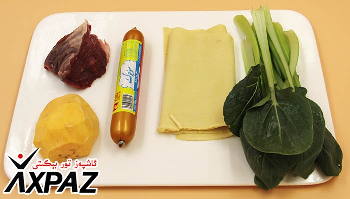 خام ماتىريالى:كالا گۆشى،قوي قۇۋرىغىسى.راك ،قېزا ،بەرەنگە،تاتلىق بەرەنگە،ماش ئۇگرىسى ،قېرىنقۇلاق ،ئۇن تېلىپى،گومبىمەدەك،مايلىق يېسۋىلىك ،غولپىياز مايسىسى،ماش ئۇيىتما ۋە ئوزىڭىز ياقتۇردىغان گۆش ۋە كۆكتات تۇرلىرى